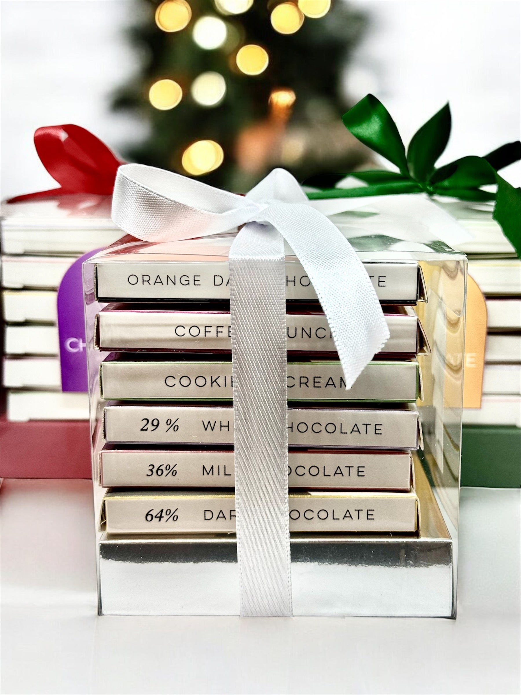 Contains a 1oz bar of Dark Chocolate, Milk Chocolate, Cookies and Cream, White Chocolate, Orange Dark Chocolate and Coffee Crunch. Perfect for a great gift.